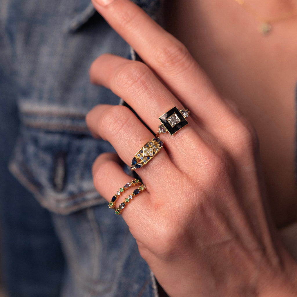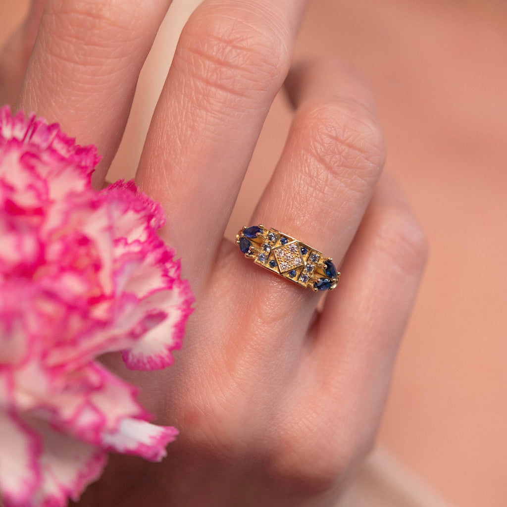 The Ava ring 2 is handmade in 18 carat recycled yellow gold and set with 21 precious stones : 8 navy blue sapphires including 4 Marquise-cut, 8 light blue sapphires and 5 white diamonds. The central form elegantly fits the shape of your finger.