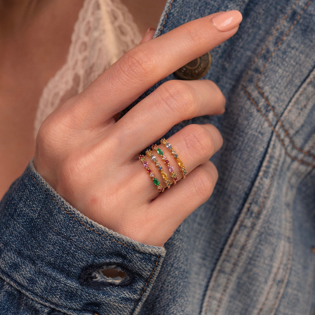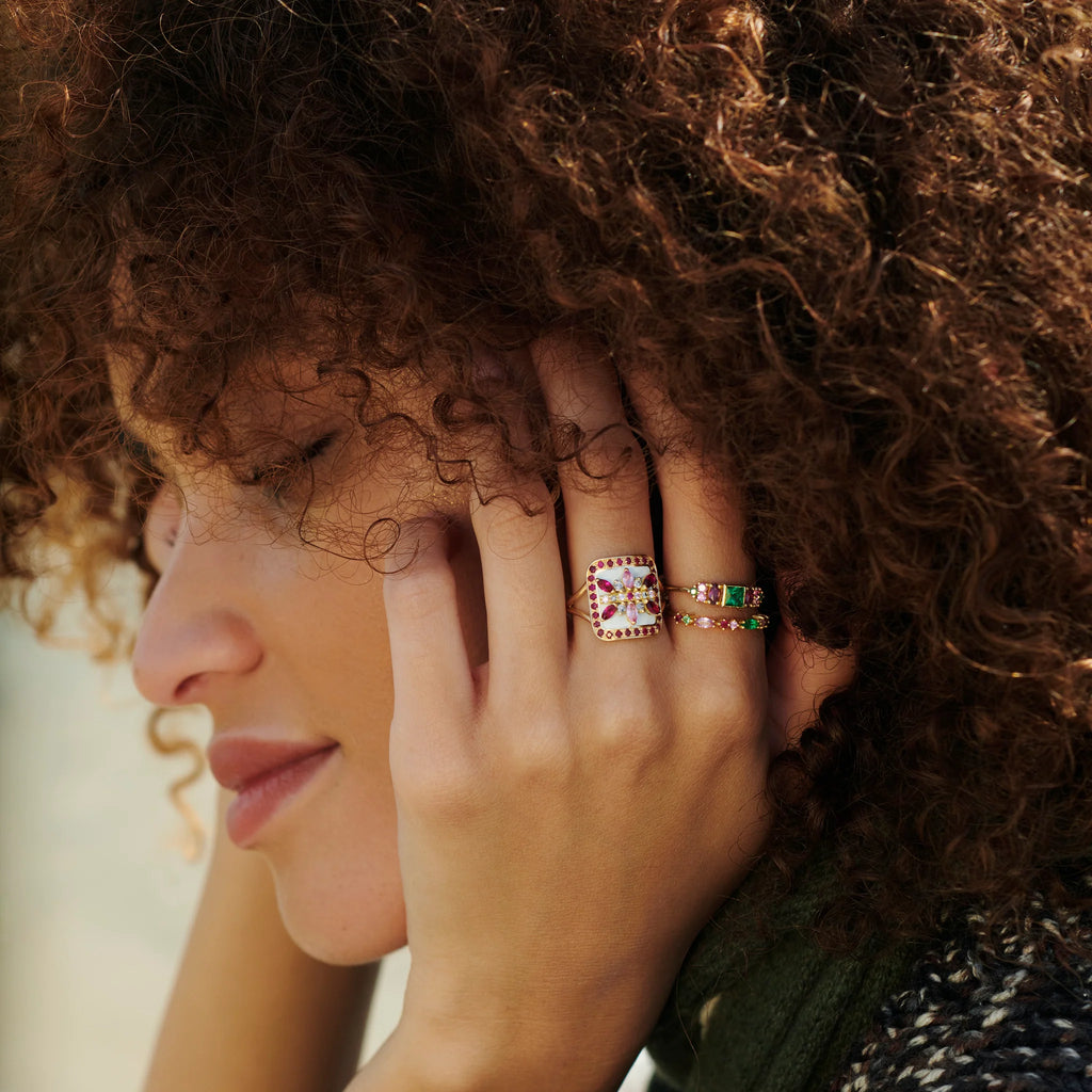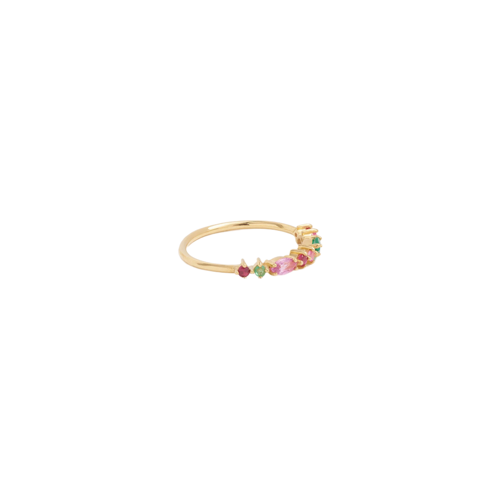 An elegant gold band fitted with brightly colored precious stones. This combination of gold with a subtle spring color palette reveals the beauty of the stones. The Gaia ring 2 Red is ideal as a unique and audacious wedding band. Bright and delicate, Gaia rings can be combined together infinitely. Alone or stacked, dare to create your own style!