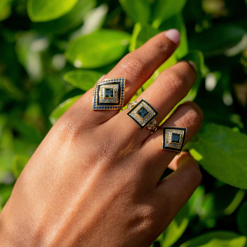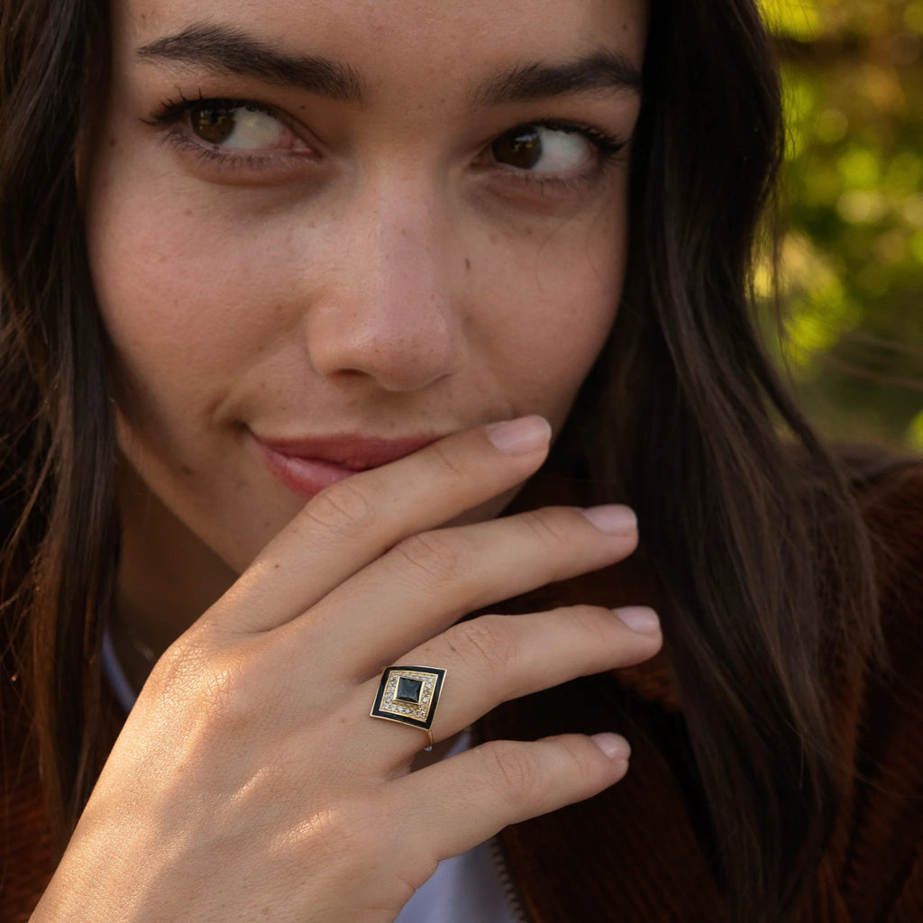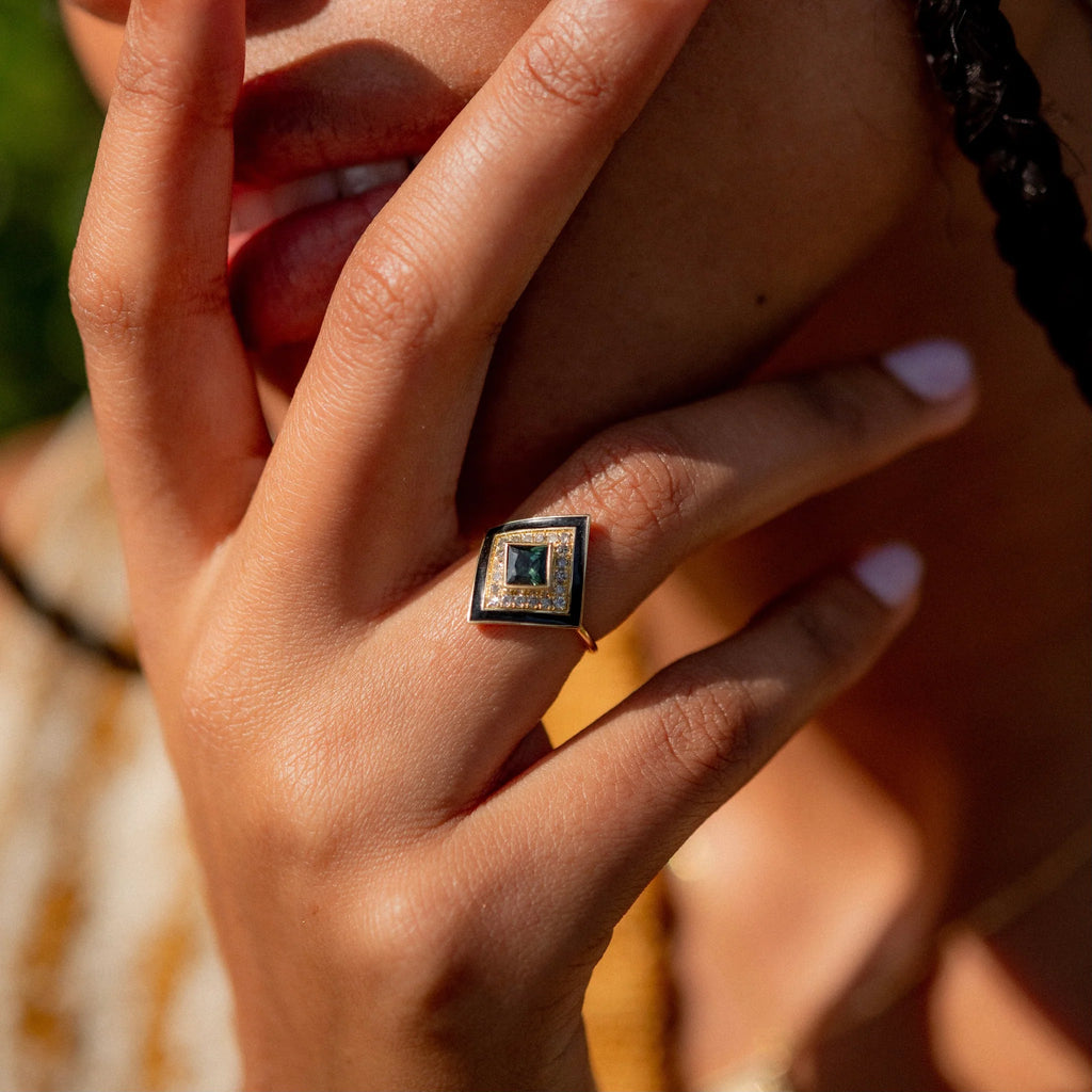 A modern heirloom. The Ginger ring 4 embodies the very best of Sophie d'Agon: flattering graphic lines, a second-skin shape and an elegant mix of colored gemstones. We fall for this princess-cut forest green sapphire that gold, enamel and "salt and pepper" diamonds sublimate with delight. An everyday jewel that is the perfect size to follow you on your adventures.
