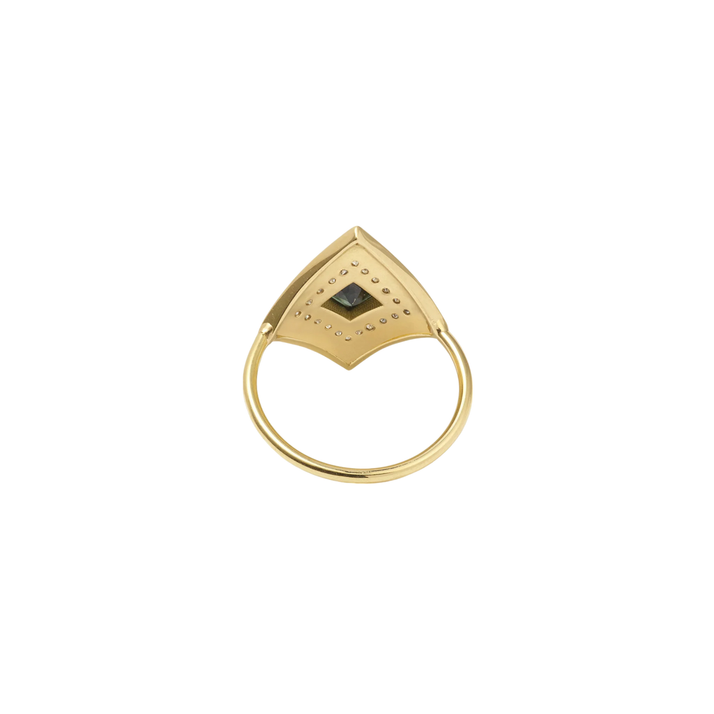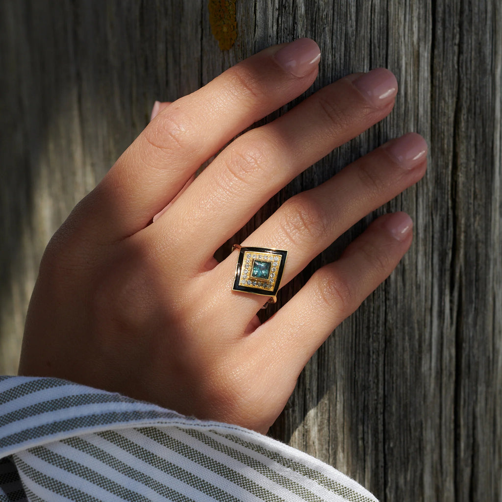 The Ginger ring 4 Forest is handmade in 18 carat recycled yellow gold with black enamel and set with 21 precious stones : 1 Princess-cut forest green sapphire and 20 salt and pepper diamonds. The central form elegantly fits the shape of your finger.