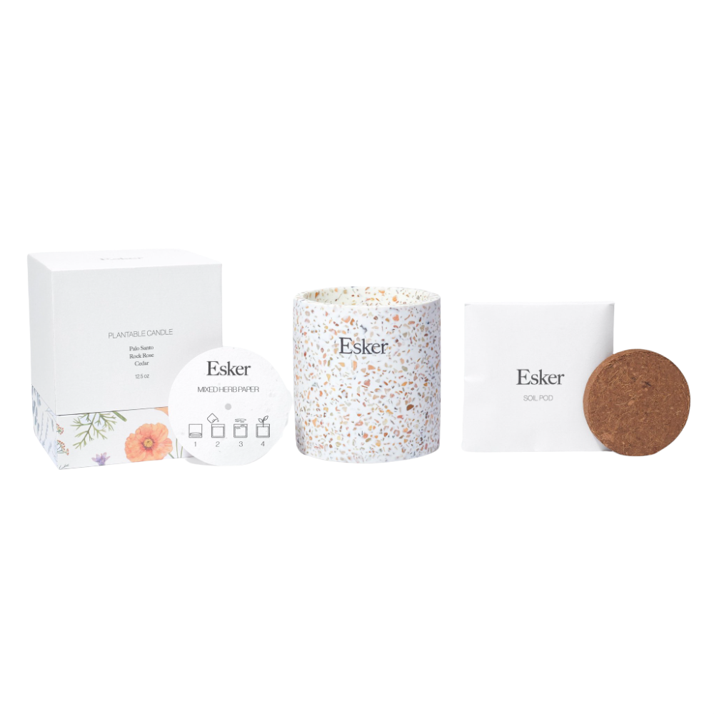 When the candle is fully burned, use the included SEED PAPER - our unique, plantable take on the paper dust cover, with culinary herb seeds embedded inside - and a SOIL POD with water inside the terrazzo vessel. From there watch your herb garden grow.