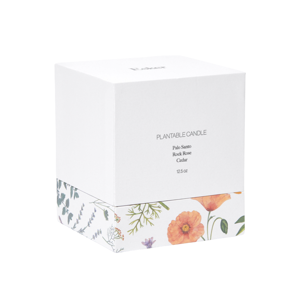 A our zero-waste PLANTABLE CANDLE. Taking a sustainable approach to gifting we took a classic, luxury candle and gave it a multi-purpose lifespan. Our hand-poured, soy-based CANDLE is a natural blend of Palo Santo, Rock Rose and Cedar notes. Ideal for burning tub side or in your bathroom sanctuary the aroma draws from nature with Japanese bathing inspired woodsy base notes of cedar mixed with musky palo santo and sweet herbal rock rose.