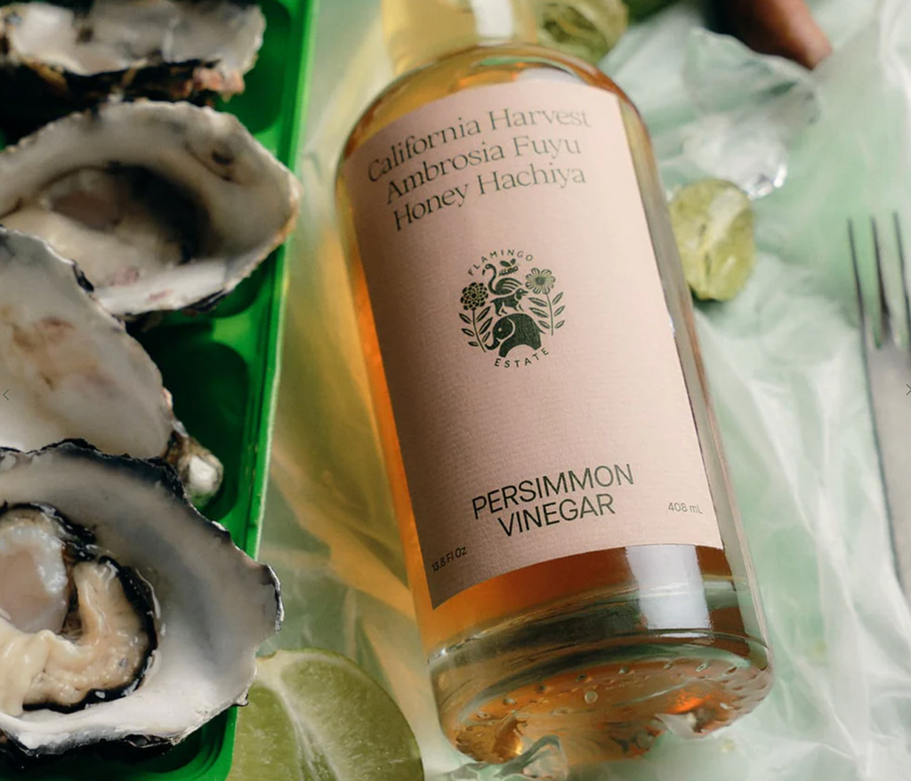 Our Persimmon Vinegar is the shining star. It bursts with flavor, adding brightness to anything it touches. It is handmade by White Buffalo Land Trust with Fuyu & Hachiya Persimmons grown by farmers dedicated to improving soil health. They’re an amazing group of people devoted to regenerative land stewardship, and this Vinegar stands for that. The delicately sweet and tart flavor gets better and better with time, and it’s perfect on salads, marinades, or as a shrub.