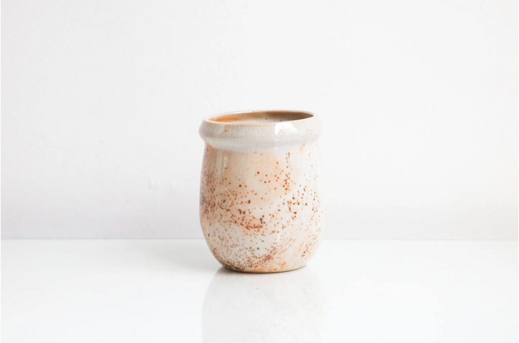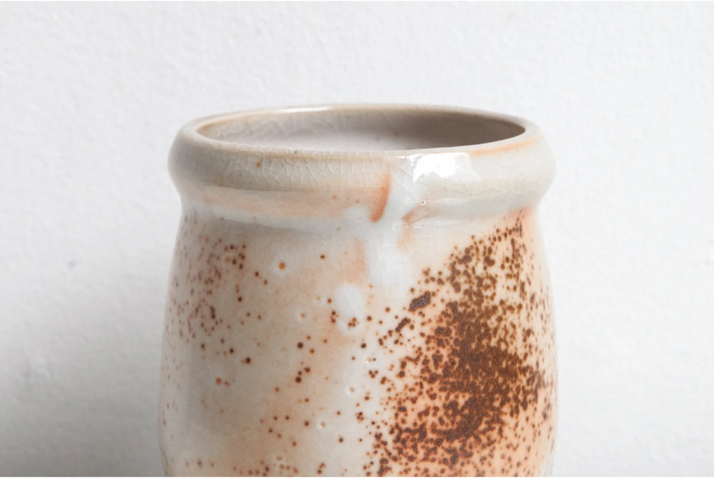 Glaze: Shino, Our modified take on the Japanese Shino glaze, with traditional crazing (small crackles in glaze). Finishes range from bright white with coppery crystals and bronze speckling to orange flashes with swirls of smoky carbon.