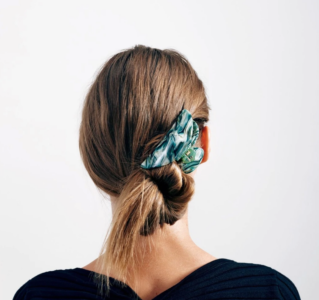 The model wears our Midi Heirloom Claw in Stromanthe.
