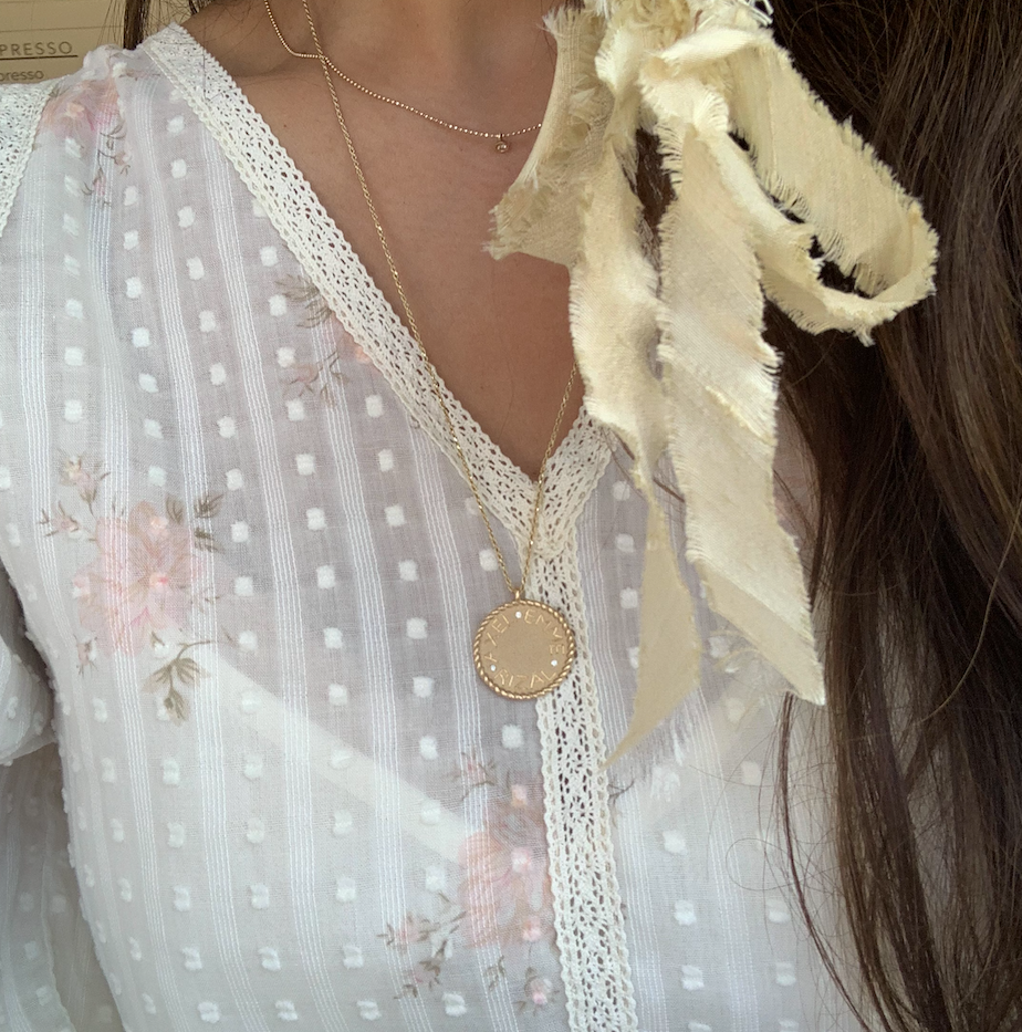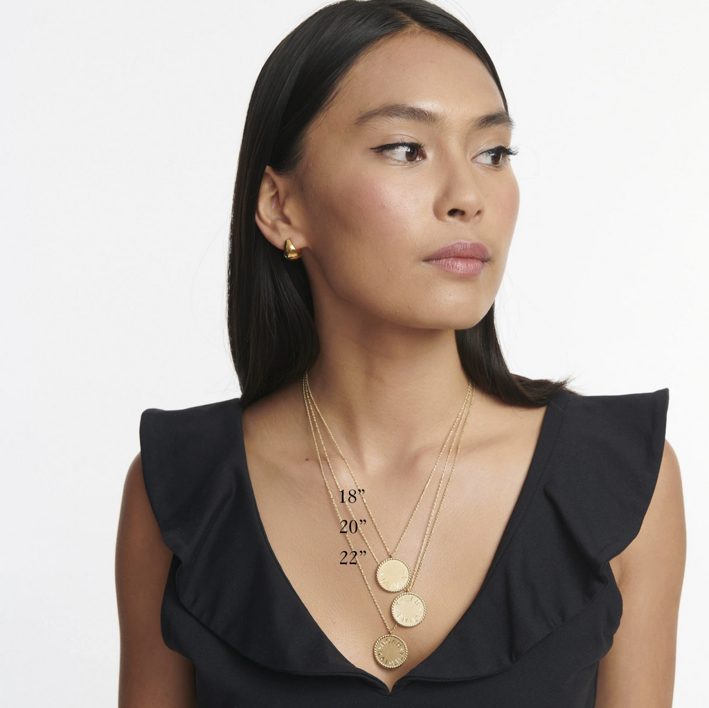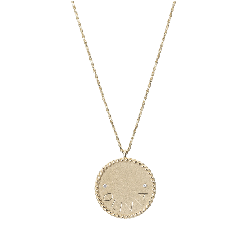 | Our Imperial Disc Pendant is a chic take on our best-selling Medallion Signet Necklace that Ariel Gordon designed when she wanted a necklace that could accommodate both of her kid's names. Evoking a castaway 70s vibe, it's chic as can be with its long twisted rope chain, sans serif engraving, sandblast finish, and high polish textured border. You can engrave around the perimeter of the disc, on the top / bottom, or leave it blank. Available with tiny diamond detail for a little extra sparkle. |