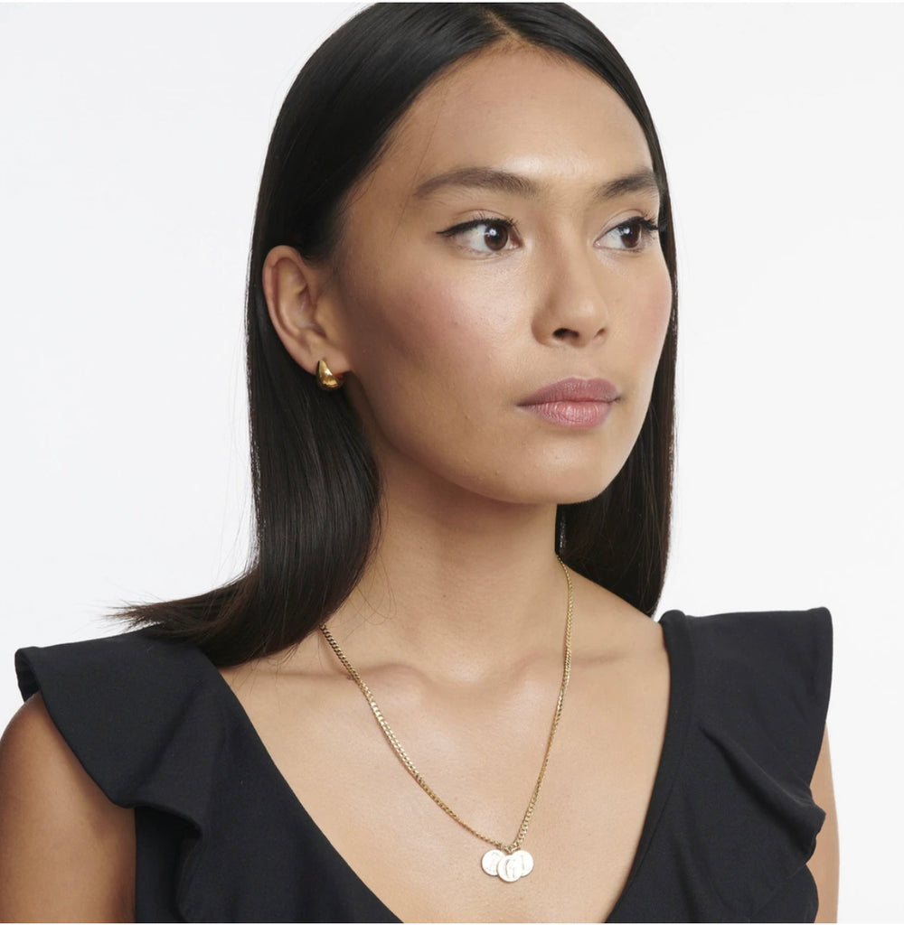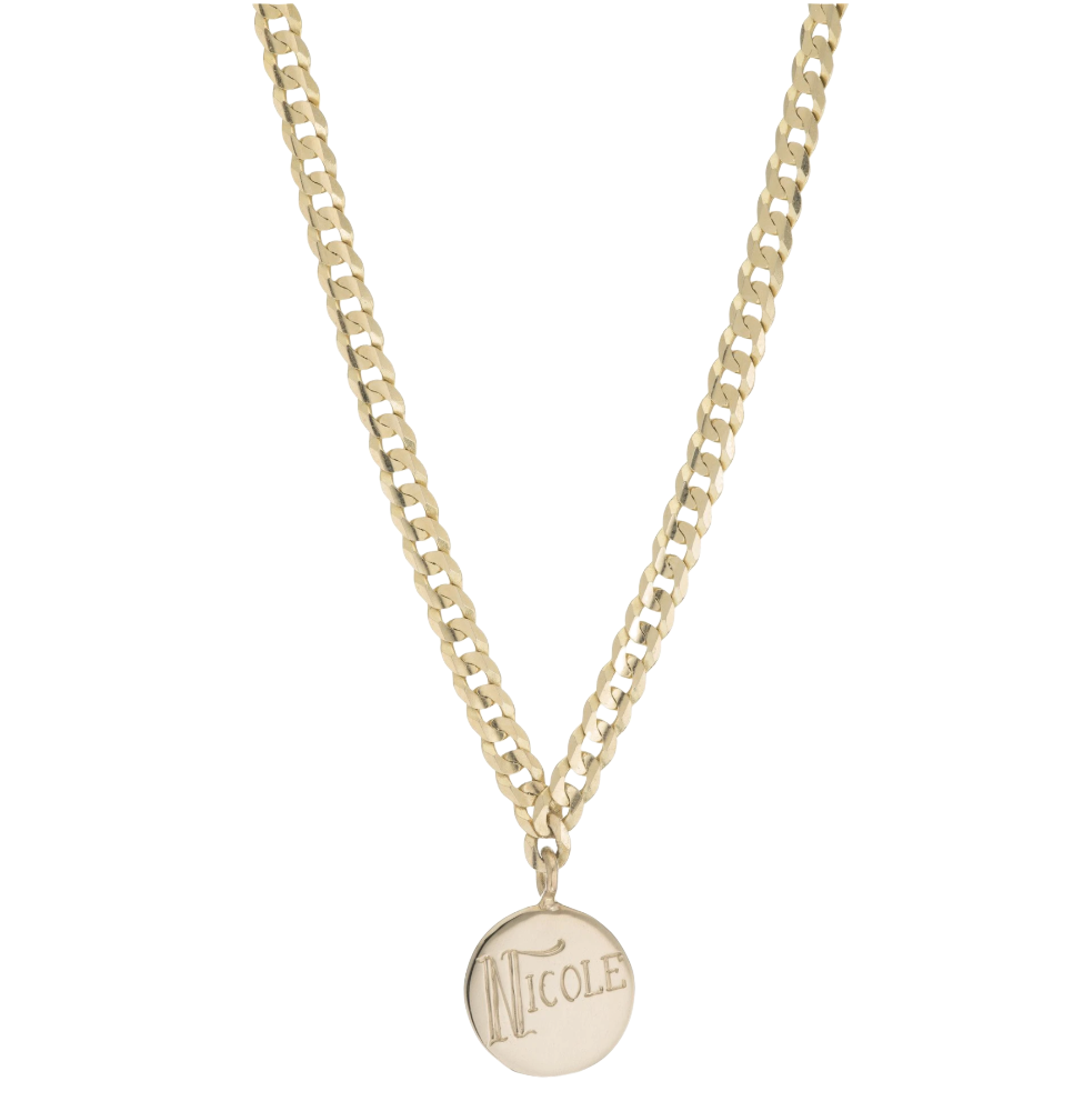 The vintage quality of the Medallion Signet Necklace pays homage to the aesthetic of the '70s with a chunky faceted cuban chain. Made-to-order with a hand engraved flowery block font, it's the perfect way to keep loved ones close to your heart. Now available with multiple charms, each disc can hold up to six letters.