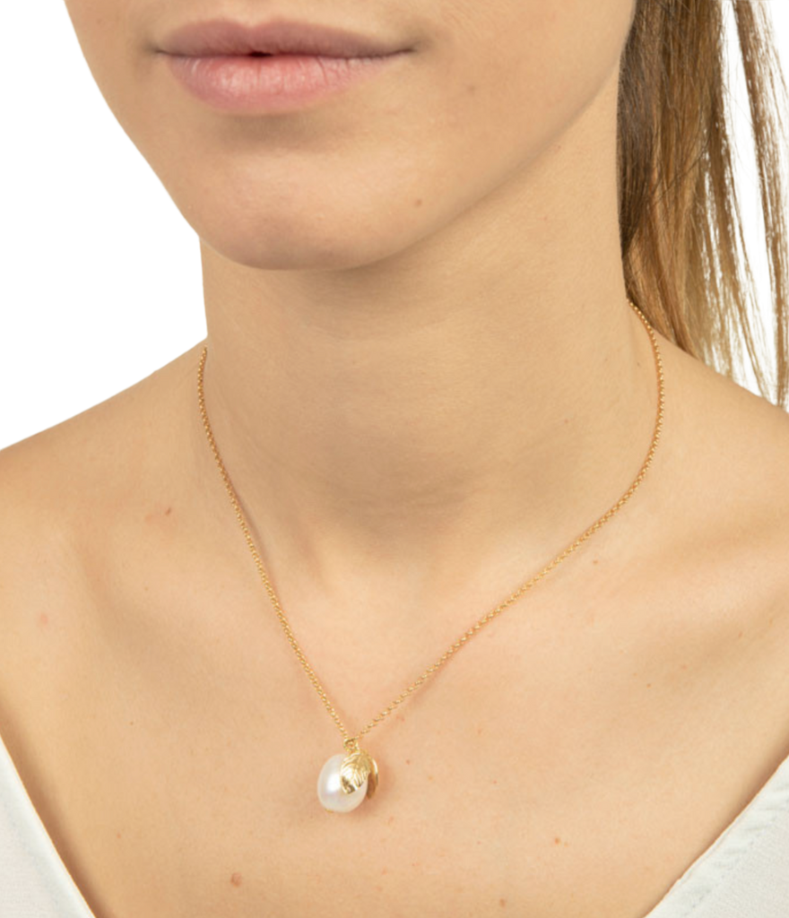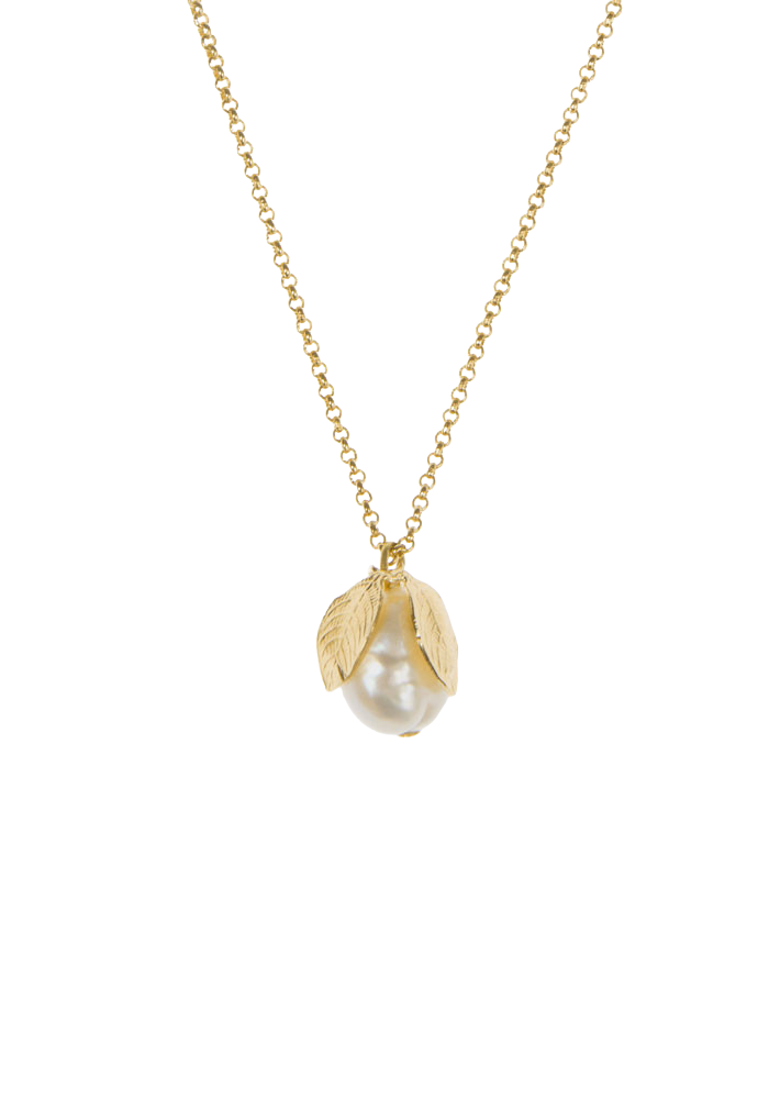 Necklace gilded with 24 carats gold and adorned with a freshwater pearl and a pair of golden leaves.