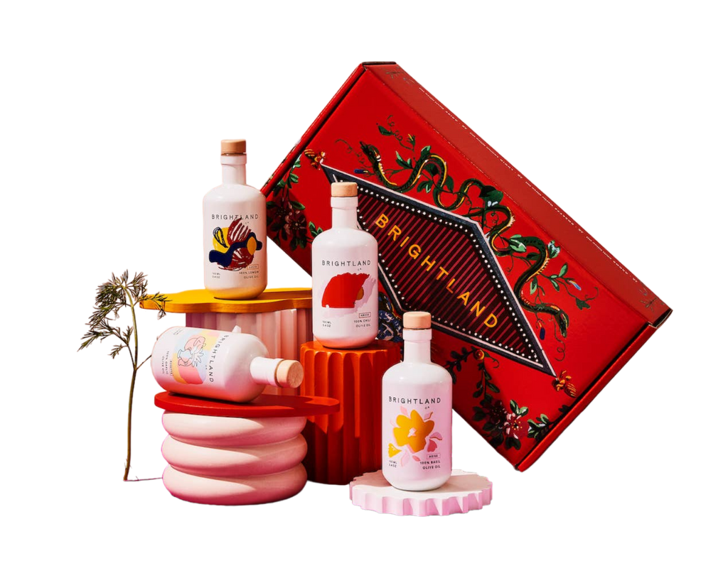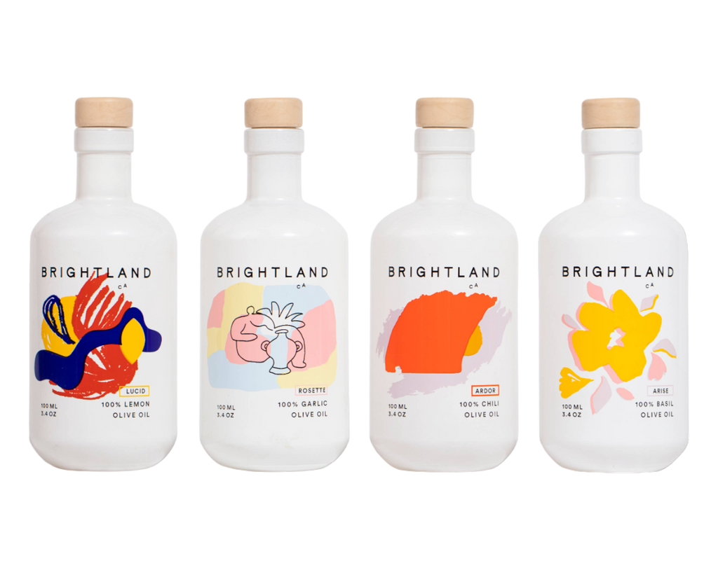 Brightland's Mini Artist Series is a beautiful 4-piece gift set containing petite versionsof Brightland's best-selling infused olive oils, all packaged in a special artist-designed outer box. It makes a stunning gift for food lovers and art aficionados alike. Includes 100ml bottles of:
