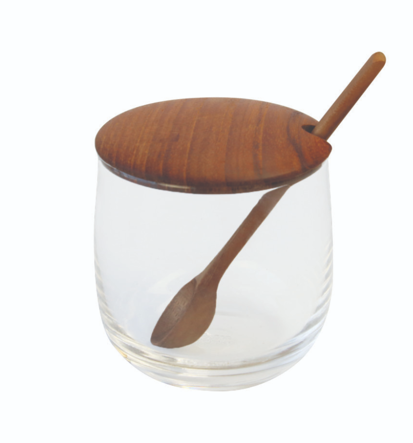 Made of recycled glass with a teak lid and spoon, this little jar is perfect for storing salt, pepper or frequently used spices. A gorgeous everyday item for your tabletop.