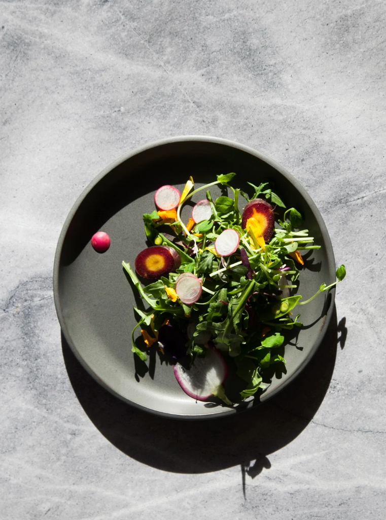 Glaze: Slate, A soft matte charcoal with metallic speckling - that sets off food and drinks in striking fashion.