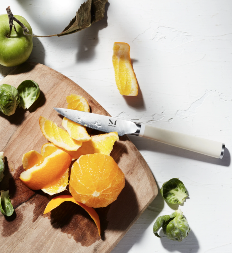 Top-heavy knives cause hand-cramping. Our blade is a full tang: it extends into the handle, so weight is better distributed, and won’t break under pressure. Inspired by narrow-tipped Japanese knives and rigorously tested, the knives feature a 13° edge for precise cuts and enduring sharpness. At finishing, each knife is hand-polished, then heat-treated at 300°F before it’s cryogenically tempered at well-beyond freezing -250°, altering the structure of the steel on a molecular level, making it harder, sharper, and more durable.