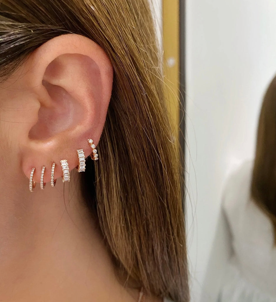 Three rows of sparkling diamonds create a glimmering illusion. One of the rows of this huggie earring features a post back, while two are backless. It features 0.15 carats of diamond set in your choice of gleaming 14k yellow, rose, or white gold. Designed to be specific to each lobe and sold individually.